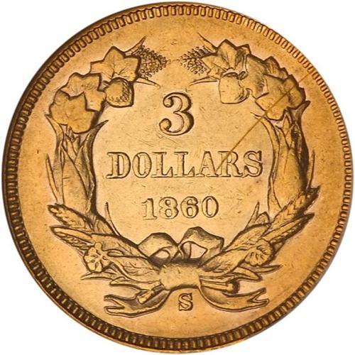 The 1860-S represents the latest-dated collectible San Francisco Mint $3. The only later issue is the famous 1870-S, showcased in the unique ex Eliasberg specimen.