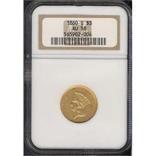 <b>1860-S $3 Gold. NGC graded AU58.</b> The San Francisco Mint produced $3 pieces of the varieties 1855-S, 1856-S, 1857-S, and 1860-S, after which only the 1870-S $3 was made, the latter coin considered to be unique today.