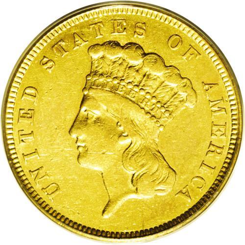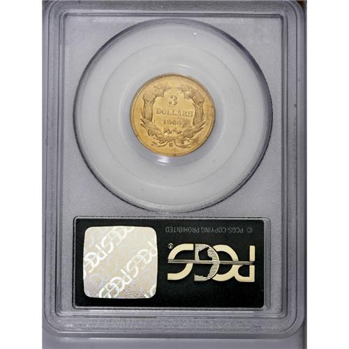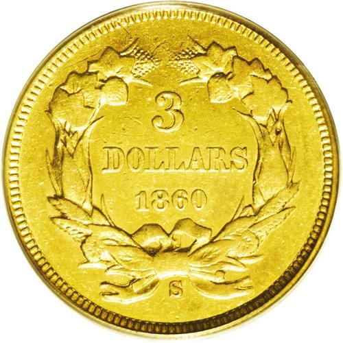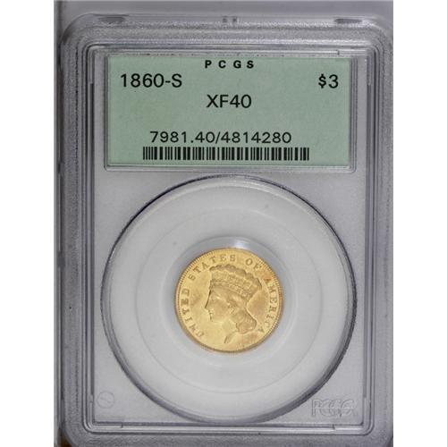 <B>1860-S<$3> XF40 PCGS.</B></I> This is an important date in the series of three dollar gold coinage. Although 7,000 coins were originally struck, Walter Breen reported that 2,592 of these were discovered to be light weight, and were never released, eventually being melted nearly a decade later. Dave Bowers wrote: "This is the rarest of the early San Francisco Mint $3 varieties. Somewhat more than 100 coins are believed to exist, nearly all of which show significant circulation with little in the way of eye appeal." While this coin seems to fit the mold of significant circulation, the surfaces are pleasing and the eye appeal is clearly above average. Medium yellow color is accented by pale orange toning.<BR><I>From The Derrick Snider Collection.</B></I>