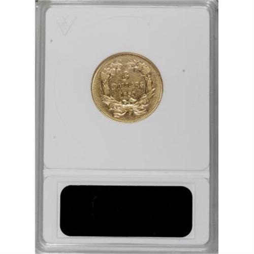 <B>1860-S $3 --Cleaned--ANACS. XF45 Details.</B></I> Though the holder inexplicably leaves off the reason for the details grade, the lemon-gold surfaces show suspiciously uniform luster and hairlines in the fields. Well struck with light, even wear across the devices. One of just 7,000 pieces struck.<BR><BR><B>Coin Engraver:</B> James B. Longacre<BR><BR><b>Shipping:</b> Coins & Currency (<a target="_blank" href="http://www.heritageauctions.com/common/shipping.php">view shipping information</a>)