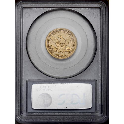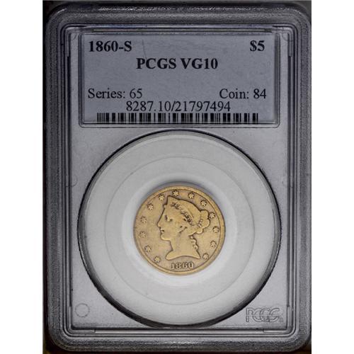 <B>1860-S<$5> VG10 PCGS.</B></I> The paltry mintage of 21,200 pieces accounts for this issue's rarity in all grades. PCGS has graded a total of 29 pieces in all grades, with the majority of examples ranging from Very Good to Very Fine condition (3/06). The present example shows the large S mintmark boldly, although extensive circulation has effaced all but the deep detail from the coin. There are no major abrasions, although a pinscratch is noted between the eagle's right (facing) wing and the arrowheads.<BR><I>From The Steve Glenn Collection.</B></I> <BR><BR><B>Important notice:</B> Heritage usually auctions material at the rate of 200-250 lots per hour. On some occasions eBay Live bid software or the Internet may not be able to keep up with the pace of the auction. We recommend placing a realistic absentee bid now as insurance to avoid disappointment. Occasionally the auctioneer may eliminate or reject an eBay Live bid, and the auctioneer may also reopen a lot after the close of the eBay live bidding (usually because we missed an audience bid), and may reject your bid even if it shows you as the winning bidder. By bidding via eBay Live, you agree that Heritage may award the lot to another bidder at its sole discretion under the circumstances described above or any other reasonable circumstances. Since eBay bids are not shown to us until we open the lot on the floor, we treat those bids just like floor bids. In most cases the floor responds before the eBay bid is presented to us, due to Internet lag time, so for consistency we have made it a policy that floor bids are always considered first over tie eBay live bids. Also please note that all Heritage lots purchased through eBay Live carry a 20% Buyer's Premium. Please make sure you read the Terms and Conditions before you bid. This lot is being auctioned in conjunction with a live floor auction by Heritage Galleries & Auctioneers. All final auction and invoice information will be supplied by Heritage Galleries & Auctioneers, and all other information should be considered preliminary. Lot:2750 <BR><BR><B>Winning Notification and Billing:</B> After the FINAL session in this auction is complete, Heritage will send e-mail and snail mail invoices. This process normally takes several days. All final auction and invoice information will be supplied by Heritage Galleries & Auctioneers, and all other information should be considered preliminary. <BR><BR>This auction will be conducted on a live auction floor and over the Internet through eBay Live. If you choose to place an absentee bid, please take a moment to <font color='#0000ff'><u><a href='http://pages.ebay.com/liveauctions/help/before/laabsentee.html'>learn how eBay Live absentee bidding works</a></u></font><font color='#000000'>