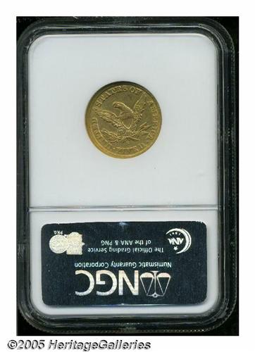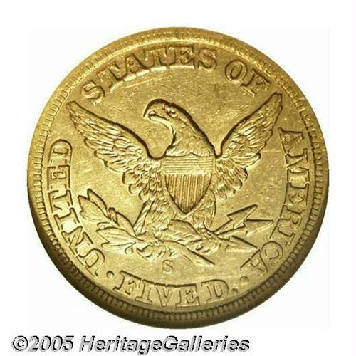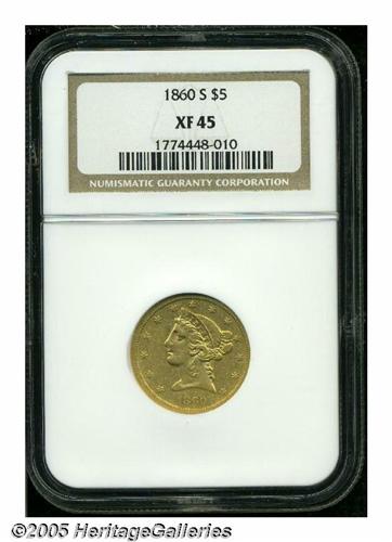 <B>1860-S<$5> XF45 NGC.</B></I> A subdued golden-orange example with the usual striking softness on the eagle. Infrequently offered in any grade, the 1860-S is particularly elusive in AU and better condition, being at least as rare as its modest mintage of 21,200 pieces would suggest. Just a single Mint State coin has been certified by either of the major services. Population: 18 in 45, 16 finer (5/05).