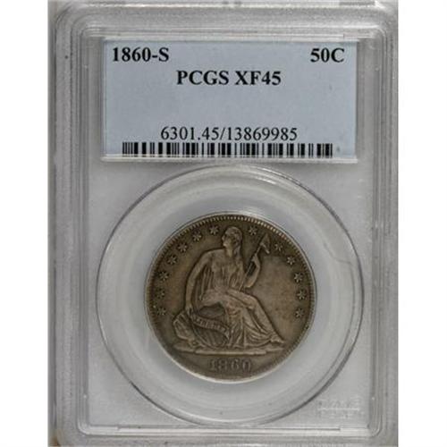 <B>1860-S 50C XF45 PCGS.</B></I> PCGS Population (5/46). NGC Census: (1/41). Mintage: 472,000. Numismedia Wsl. Price for NGC/PCGS coin in XF45: $163. (#6301)<BR><BR><B>Coin Engraver:</B> Christian Gobrecht<BR><BR><b>Shipping:</b> Coins & Currency (<a target="_blank" href="http://www.heritageauctions.com/common/shipping.php">view shipping information</a>)