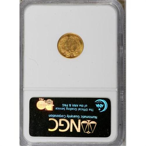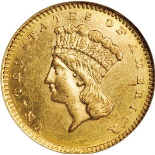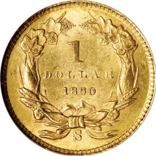 <B>1860-S G$1 MS61 NGC.</B></I> A scarce S-mint gold dollar. Only 13,000 pieces were produced, and probably no more than 125-140 individual coins are known today. Only a few dozen coins have been certified in mint condition. This is an attractive piece that has bright, semi-prooflike fields. Sharply struck, there are numerous small to medium sized abrasions on the obverse that account for the grade. Census: 17 in 61, 14 finer (8/07).<BR><BR><B>Coin Engraver:</B> James B. Longacre<BR><BR><b>Shipping:</b> Coins & Currency (<a target="_blank" href="http://www.heritageauctions.com/common/shipping.php">view shipping information</a>)