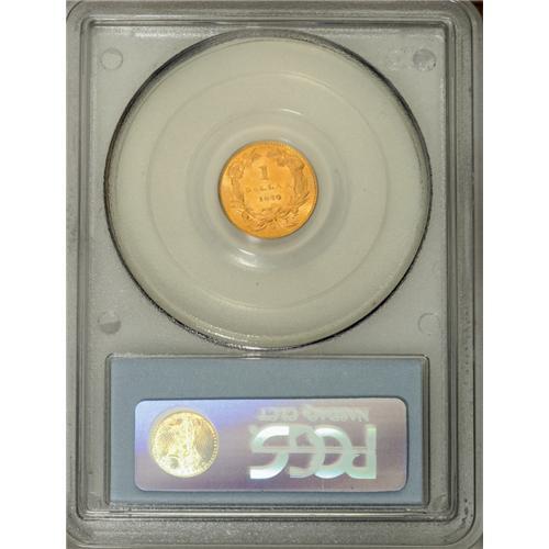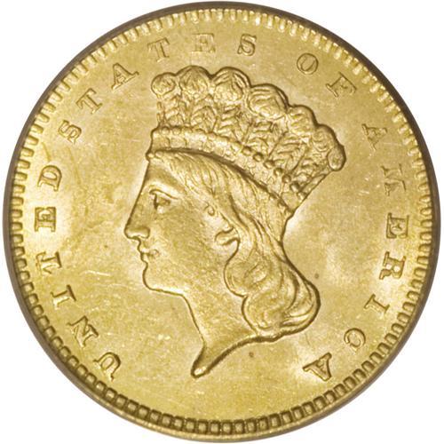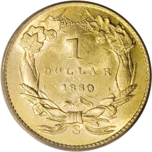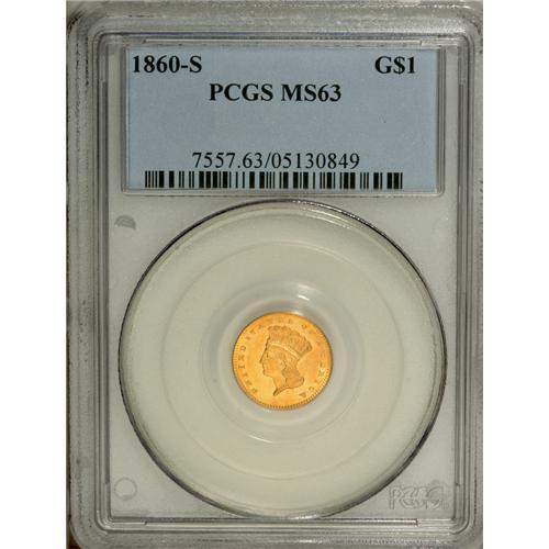 1860-S G$1 MS63 PCGS. The 1860-S gold dollar, with a m