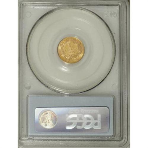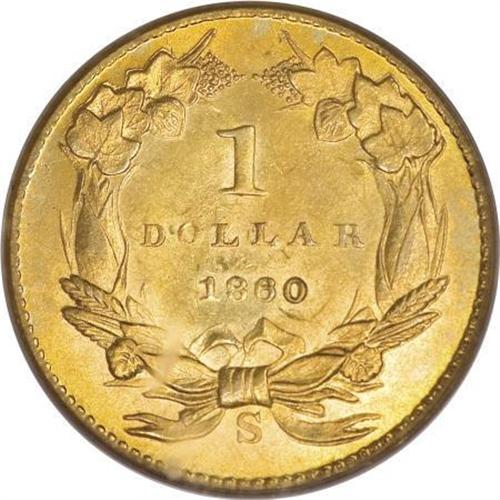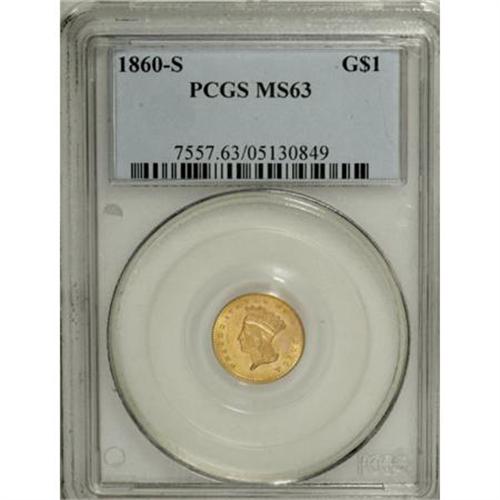 <B>1860-S G$1 MS63 PCGS.</B></I> The 1860-S gold dollar would be the final gold dollar made in San Francisco for a decade, as that facility suspended production of the denomination until the 1870-S issue. With a mintage of 13,000 pieces it is elusive, and fewer than 200 examples are believed to exist today. This Select piece displays blazing luster that enlivens the apricot-gold surfaces. The design features are well impressed, and just a few wispy marks on each side preclude a higher grade. Population: 6 in 63, 3 finer (7/07).<BR><BR><B>Coin Engraver:</B> James B. Longacre<BR><BR><b>Shipping:</b> Coins & Currency (<a target="_blank" href="http://www.heritageauctions.com/common/shipping.php">view shipping information</a>\)