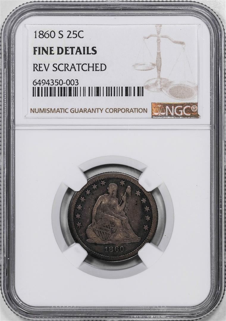 One 1860-S Liberty Seated Quarter Coin NGC Fine Details. NGC Certified.