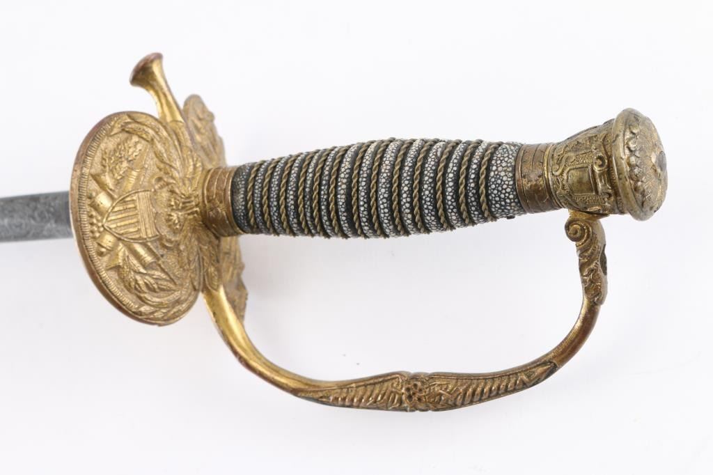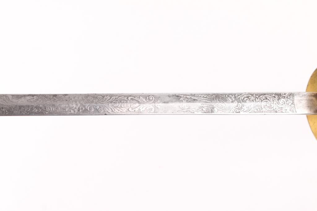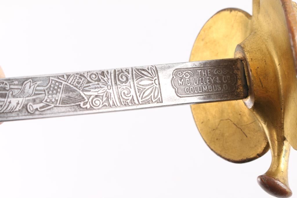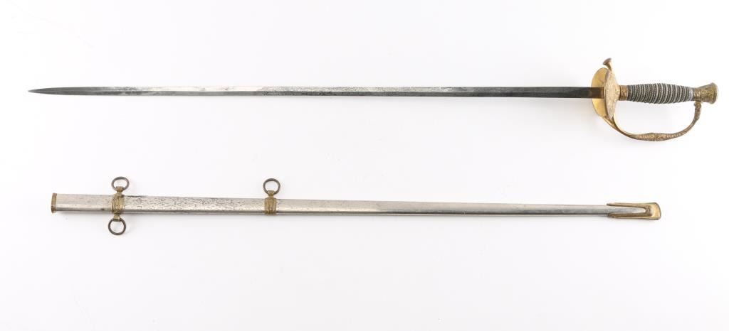 Model 1860 Staff and Field Officer’s late production sword and metal scabbard by M.C. Lilley & Co., Columbus, Ohio. Sword has 29" narrow, straight blade with etched military motifs over half its length including "U.S.", American eagle, battle trophies, etc. Brass non-folding guards with nice eagle/crossed cannons motifs. Sharkskin grip with twisted brass wire, nickel steel scabbard is very good with minor flaking, brass mounts, throat, and drag. Missing leather washer. Overall very good condition, no nicks to the blade, no scabbard dents.