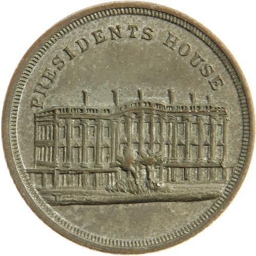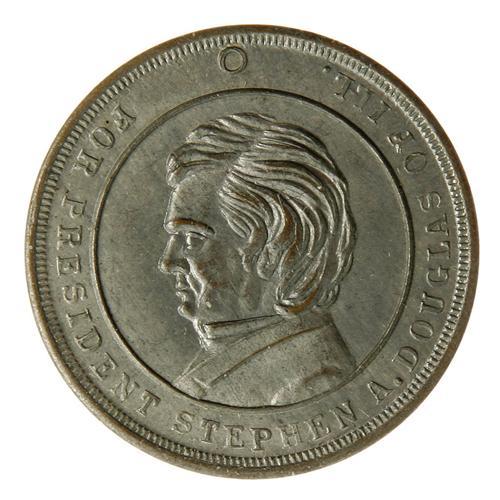 <B>1860 Stephan Douglas Civil War Patriotic Token in Silvered Brass.</B></I> Listed as Sullivan-Dewitt SD 1860-14 and measures 22mm. This Stephen Douglas campaign token from 1860 is also considered a desirable Civil War patriotic token, and is thus a piece with crossover appeal. Part of a series issued for the four presidential candidates in 1860, it depicts Stephen Douglas on the obverse and "The President's House" on the reverse. In almost uncirculated condition; nice patina present on both sides.
