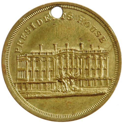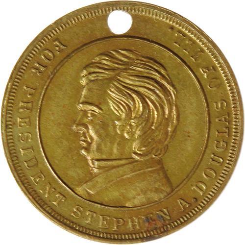 <B>1860 Stephan Douglas Civil War Patriotic Token in Brass.</B></I> Listed as Sullivan-Dewitt SD 1860-14 and measures 22mm. This Stephen Douglas campaign token from 1860 is also considered a desirable Civil War patriotic token, and is thus a piece with crossover appeal. Part of a series issued for the four presidential candidates in 1860, it depicts Stephen Douglas on the obverse and "The President's House" on the reverse. In almost uncirculated condition; holed; some dark patina on both sides but more so on the obverse; one small blemish at 5 o'clock on the obverse.
