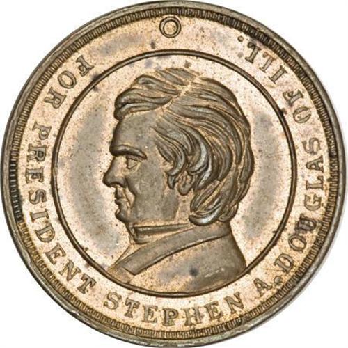 <B>1860 Stephen A. Douglas, Fuld-510/510Aa, R.8, MS60 Red and Brown Uncertified.</B></I> Sullivan SD-1860-14. Dies by B.F. True of Cincinnati, Ohio. Stephen Douglas, a long-time Illinois political rival of Abraham Lincoln, again opposed him in the 1860 Presidential election. Douglas was the Democratic candidate, but Southern states supported Bell instead, while Lincoln carried most Union states. This rare political token is about 50% mint red with a few tiny spots.<BR><BR><b>Shipping:</b> Coins & Currency (<a target="_blank" href="http://www.heritageauctions.com/common/shipping.php">view shipping information</a>)