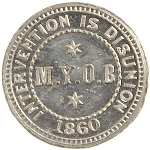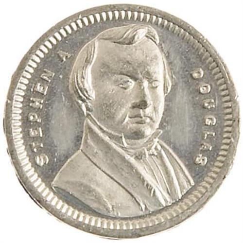 <B>1860 Stephen Douglas " Intervention" Token</B></I> Listed as Sullivan-Dewitt SD 1860-22; measures 20mm across. The obverse of this piece features a bust of Douglas to quarter right. The inscription around reads: "Stephen A Douglas". The reverse inscription around is: "Intervention Is Disunion 1860"; enclosing M.Y.O.B., with a star above and below. Beaded border on both sides. The dies for this token were cut by George Lovett of New York who did numerous tokens during this period. The "M.Y.O.B." likely stands for "Mind Your Own Business". The token in excellent condition. <BR><BR><b>Shipping:</b> Miscellaneous Collectibles, Smal (<a target="_blank" href="http://www.heritageauctions.com/common/shipping.php">view shipping information</a>)