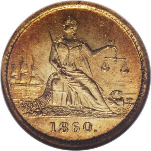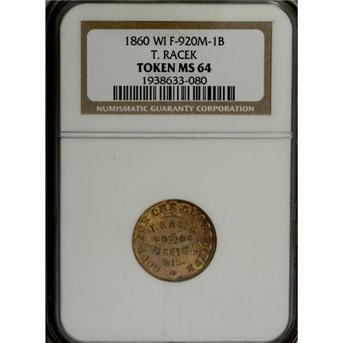 <B>1860 T. Racek Beer Token, Watertown, WI, Fuld-WI-920M-1b, R.8, MS64 NGC.</B></I> Brass. An Uncirculated token that by any standard should have been graded MS65. The obverse die employed is Fuld-920 and the reverse is Fuld-1356. While the Kanzinger guide values this piece at only $45 in MS60, we believe this piece will draw considerable attention from knowledgeable collectors.<BR><BR><b>Shipping:</b> Coin/Currency (<a target="_blank" href="http://www.heritageauctions.com/common/shipping.php">view shipping information</a>)