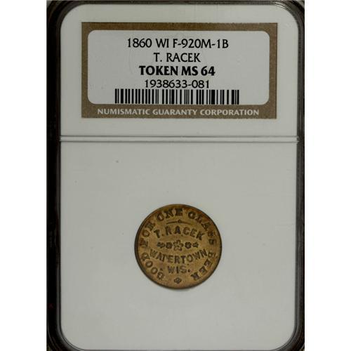 1860 T. Racek, Watertown, WI, MS64 NGC. Fuld-WI920M-1b,