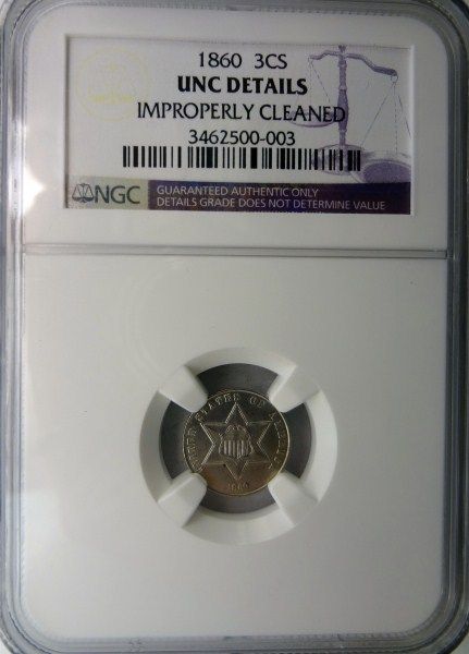 1860 THREE CENT SILVER NGC UNC CLEANED, ITS A NICE MS63 COIN, VERY RARE,