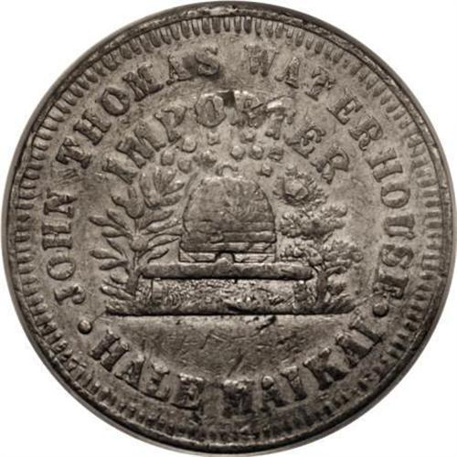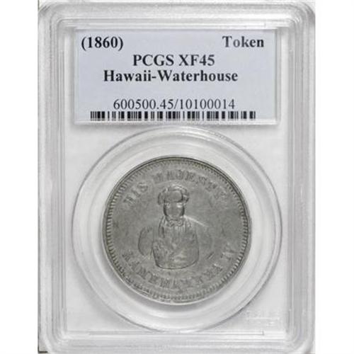 <B>Undated (1855-1860) Hawaii-Waterhouse Token XF45 PCGS.</B></I> Medcalf 2TE-1. The John Thomas Waterhouse token is the earliest known Hawaiian token. Because it was struck in soft pewter, it is "virtually impossible to find above EF condition," per Medcalf. This cream-gray representative has the expected moderate highpoint wear, and a few minor marks are distributed. Listed on page 380 of the 2008 <I>Guide Book. </B></I>Population: 4 in 45, 8 finer (6/07).<BR><BR><b>Shipping:</b> Coins & Currency (<a target="_blank" href="http://www.heritageauctions.com/common/shipping.php">view shipping information</a>)