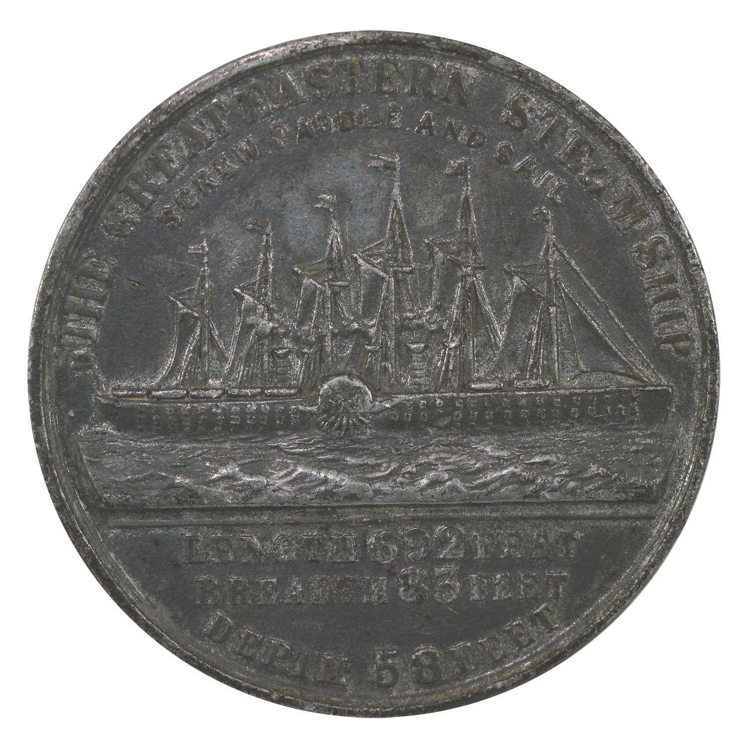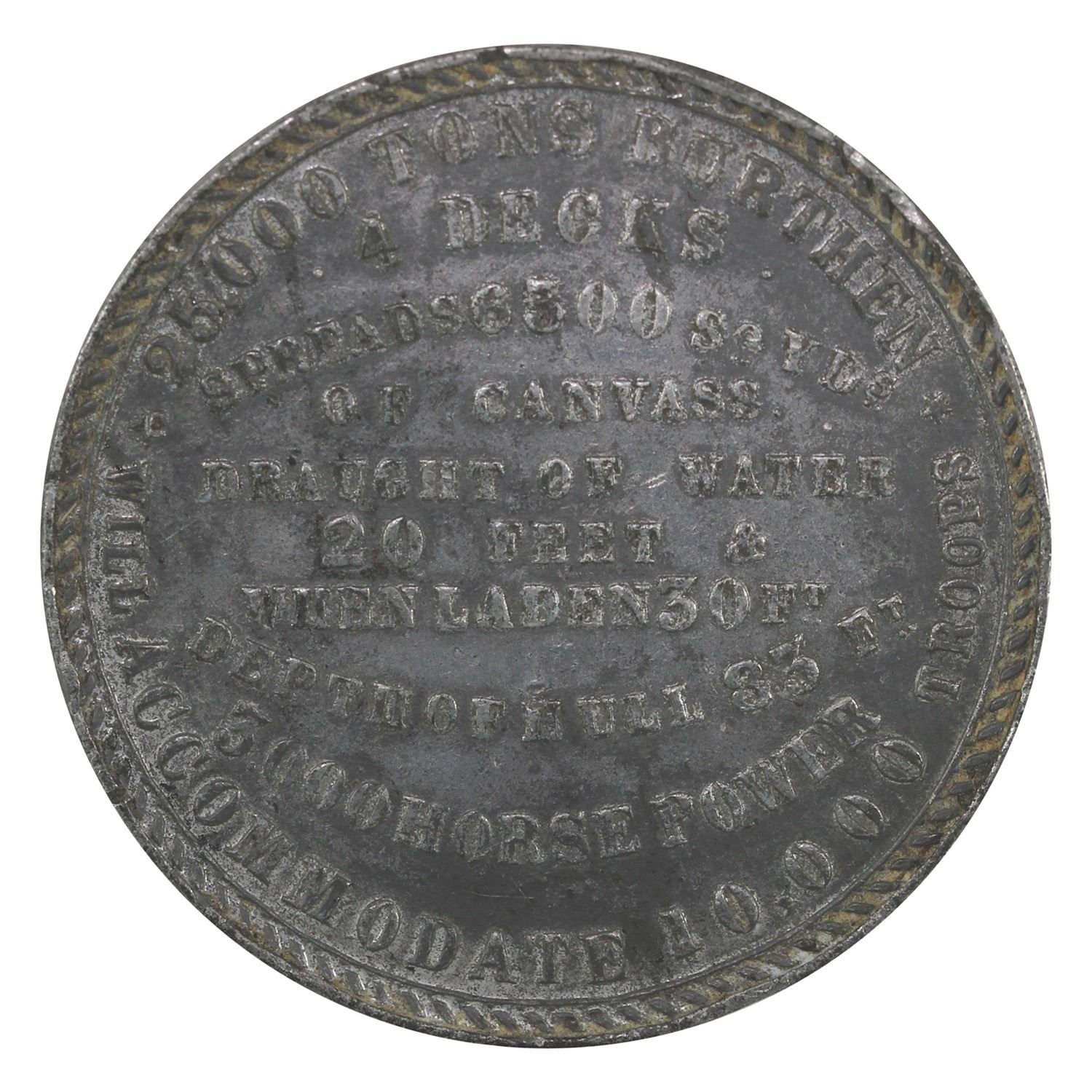 1860 The SS Great Eastern Steam Ship Tin Medallion. 41mm. Obverse lists specifications of ship. Various imperfections.