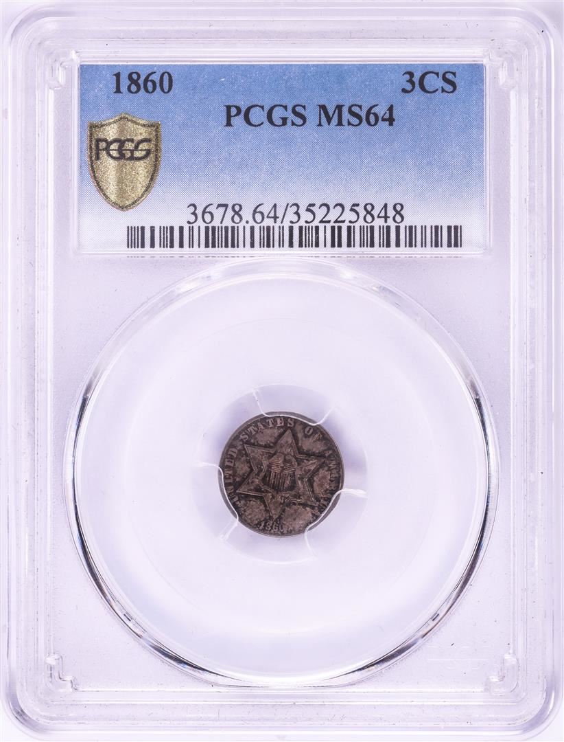 One 1860 Three Cent Silver Coin PCGS MS64. PCGS Graded.