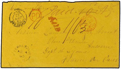 1860 Trans-Atlantic mail to FRANCE cancelled by TERREBONE datestamp with manuscript PAID charged "10" with P.D. in red, routed via Montreal with hand-struck PAID and LONDON PAID transit with manuscript "1/0 1/2" accountancy, French entry cachet and arrival. Scarce item.