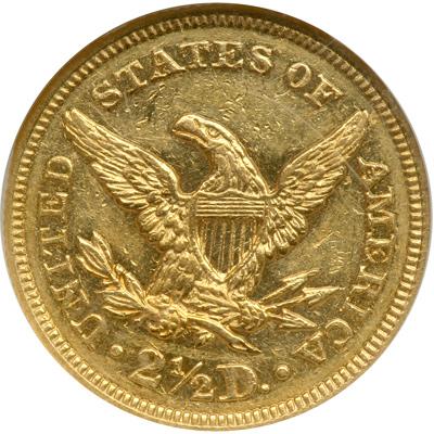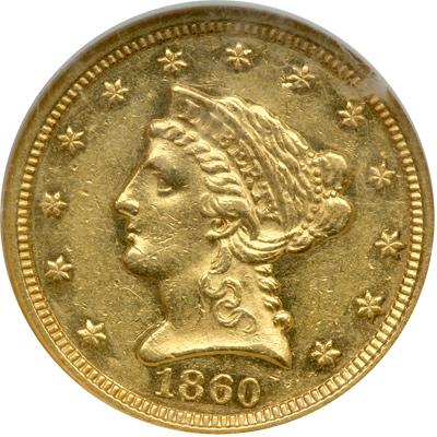 1860 Type 1. NGC graded AU-58. Type 1. Semi-reflective surfaces. A scarce Red Book variety. The old-style or Type 1 reverse of 1859/60/61 is most readily identified by the long arrowheads. This is from the hub of 1840-58, where the lowest arrowhead almost touches CA and the eagle's talons are closed.