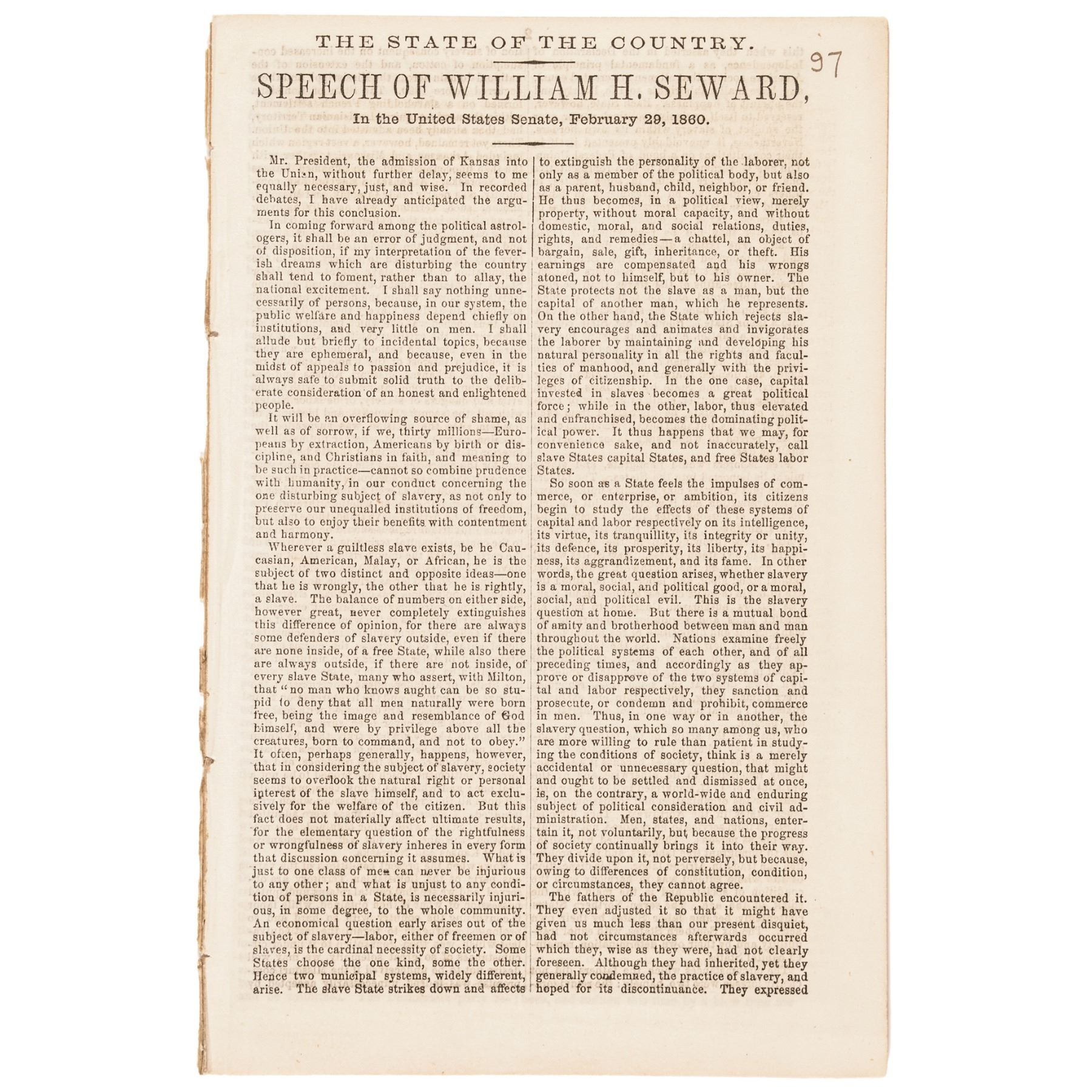 February 29, 1860-Dated Imprint titled, “The State of the Country. Speech of William H. Seward, in the United States Senate, February 29, 1860.”, 8 pages, measuring 6" x 9". Very nice crisp condition, disbound. A great piece of Civil War Era history.