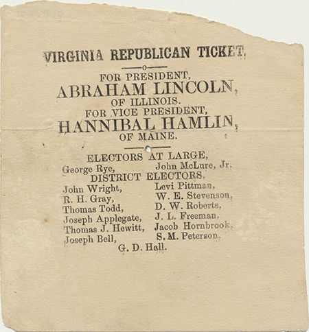 A rare printed 1860 presidential Republican campaign ballot issued by the state of Virginia on the eve of its secession, 12mo., listing the Republican slate: "VIRGINIA REPUBLICAN TICKET. For President, ABRAHAM LINCOLN of Illinois, for Vice President HANNIBAL HAMLIN, of Maine", along with local electors. Punch-hole cancel in center and signed on the verso by a certain "C. H. Kirkland" who voted for the man who would force his state out of the Union.