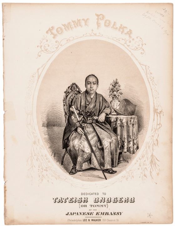 1860-Dated, First Edition, Historic Commemorative Printed Sheet Music titled, “Tommy Polka. Dedicated to TATEISH ONOGERO (or Tommy) of the Japanese Embassy,” with Central Cover Image of a Samurai in his kimono with two swords, by Lee & Walker, Philadelphia, Very Fine.