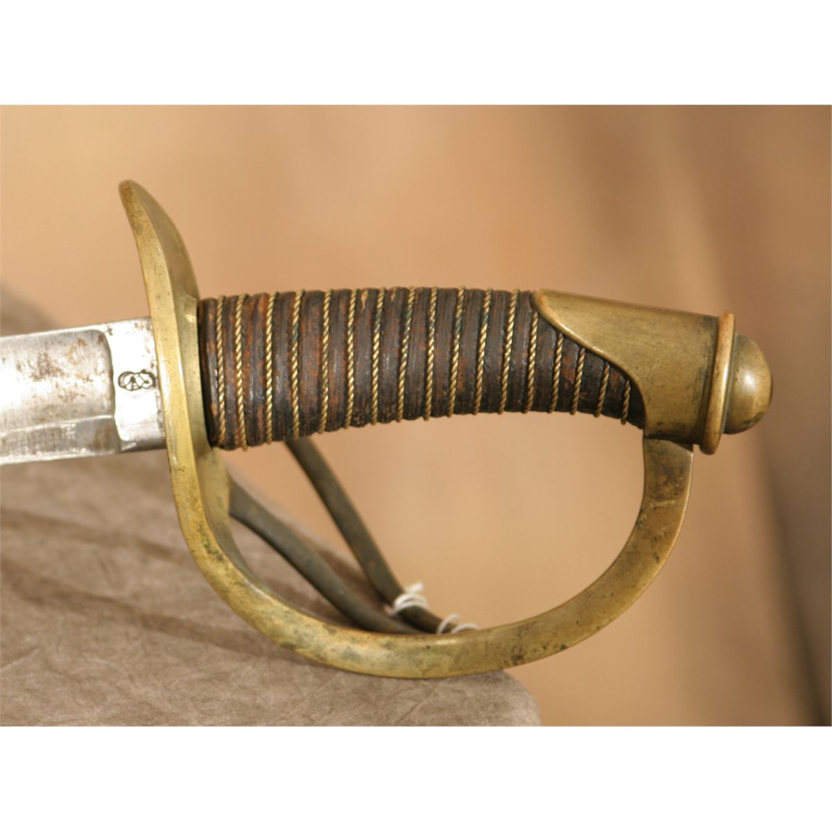 1860 light cavalry saber. Unknown proof on blade, which measures 35.5". Includes a brass basket and original wire wrap on handle. Handle is tight. Blade is very good. Possible confederate. Blade has been sharpened.