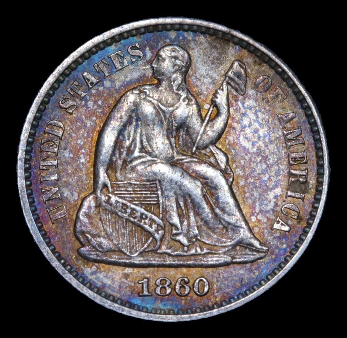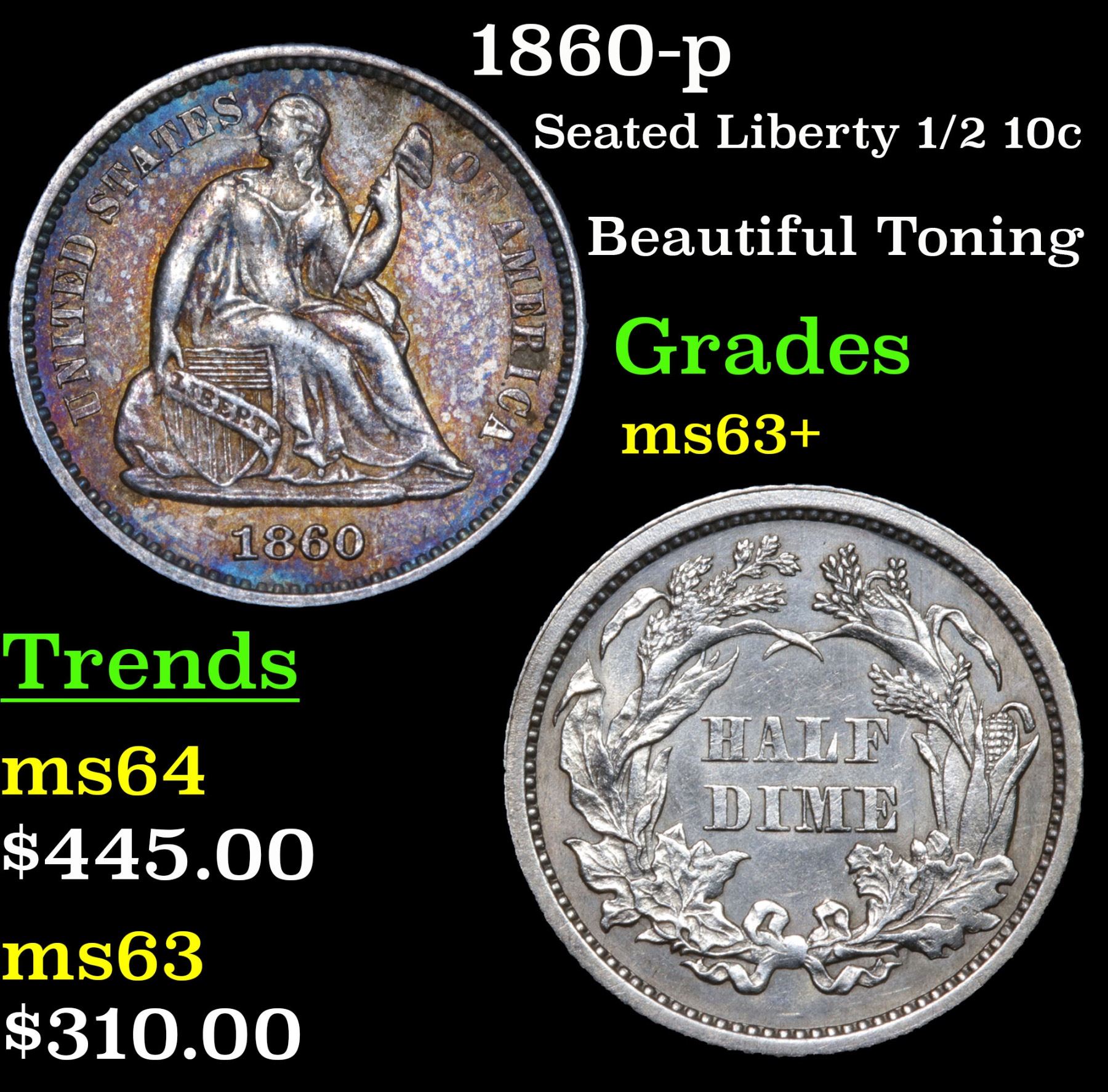 1860-p Beautiful Toning . Seated Liberty Half Dime 1/2 10c Grades Select+ Unc.