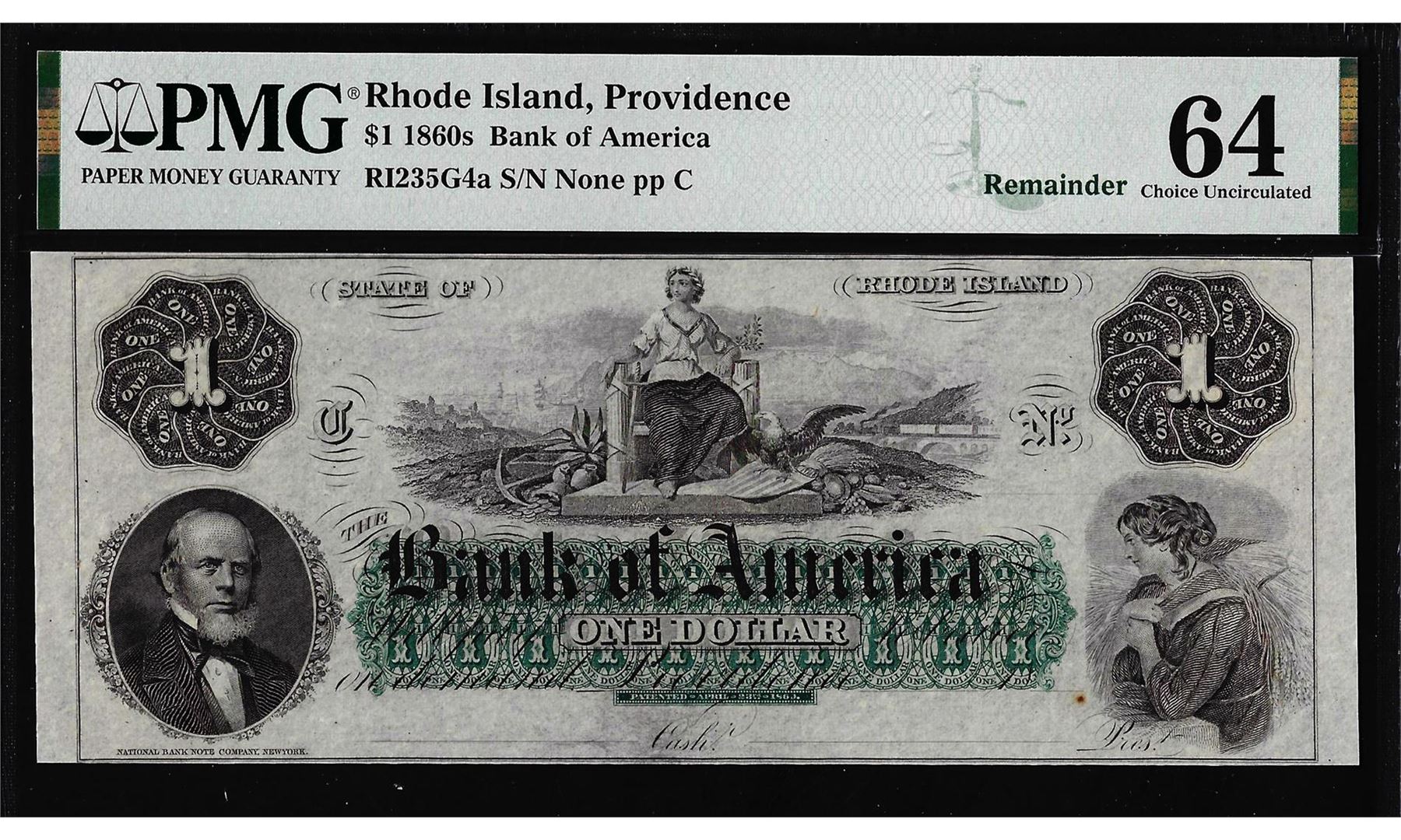 One 1860's $1 Bank of America Providence, RI Obsolete Note PMG Choice Uncirculated 64. PMG Certified.