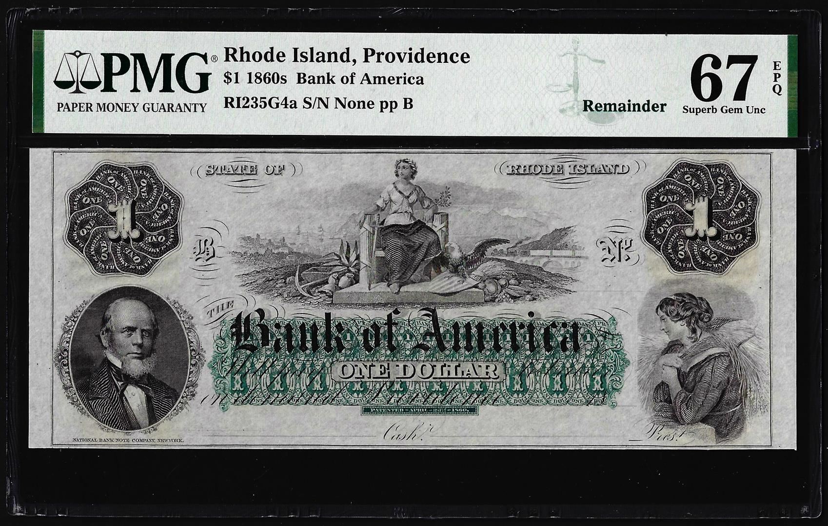 One 1860's $1 Bank of America Providence, RI Obsolete Note PMG Superb Gem Unc 67EPQ. PMG Certified.