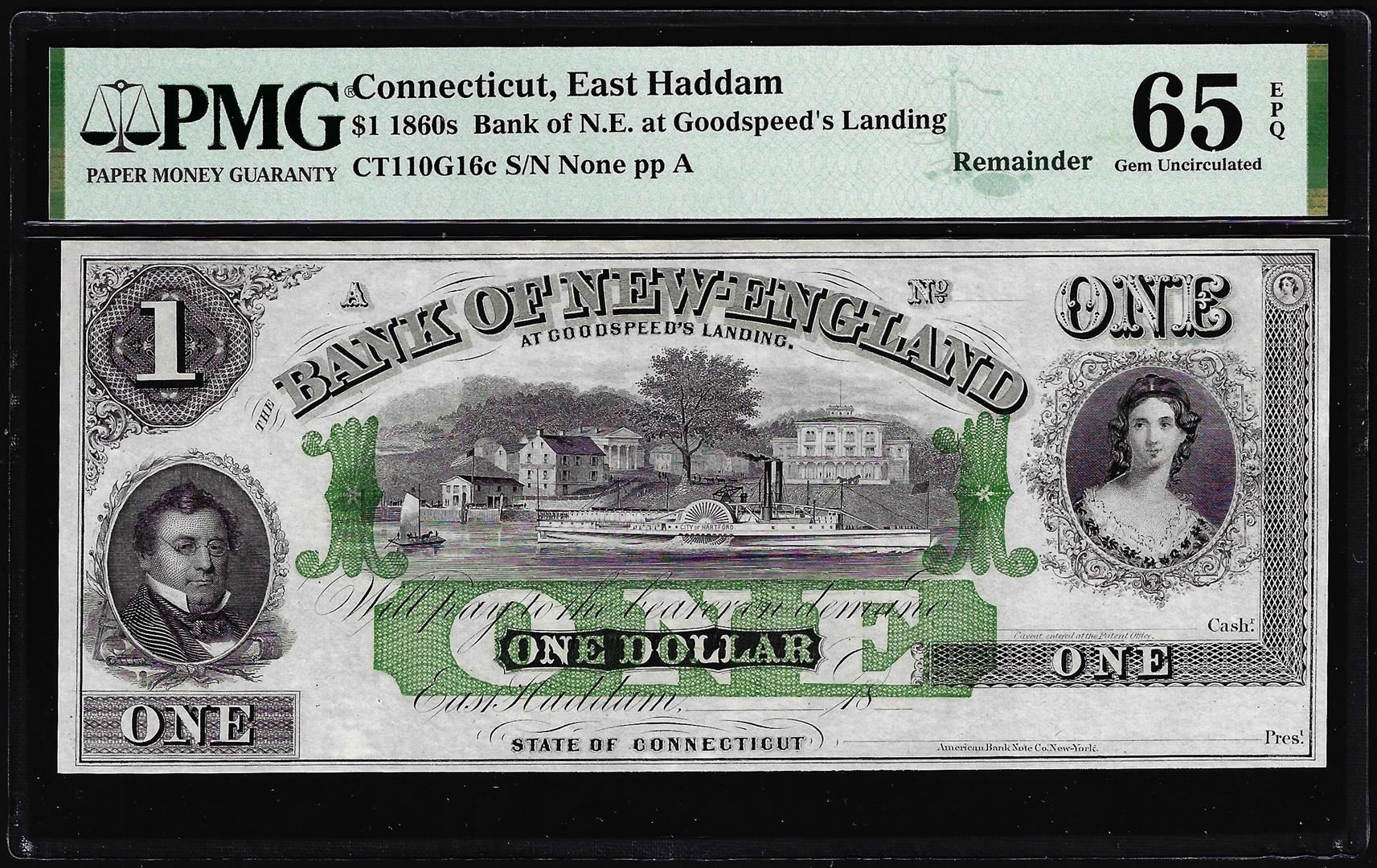 1860's $1 Bank of New-England East Haddam, CT Obsolete Note PMG Gem Uncirculated 65EPQ