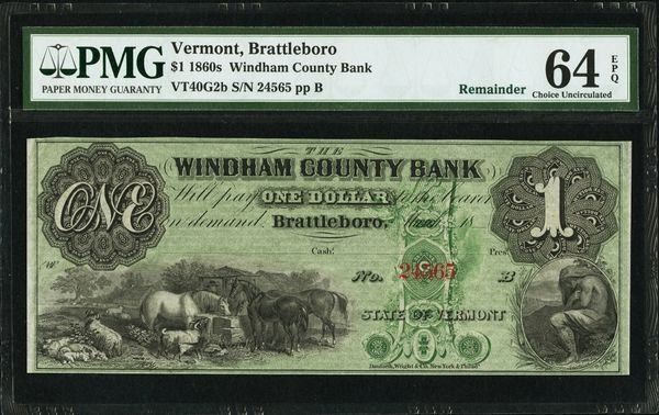 One 1860's $1 Brattleboro VT Note PMG 64EPQ.