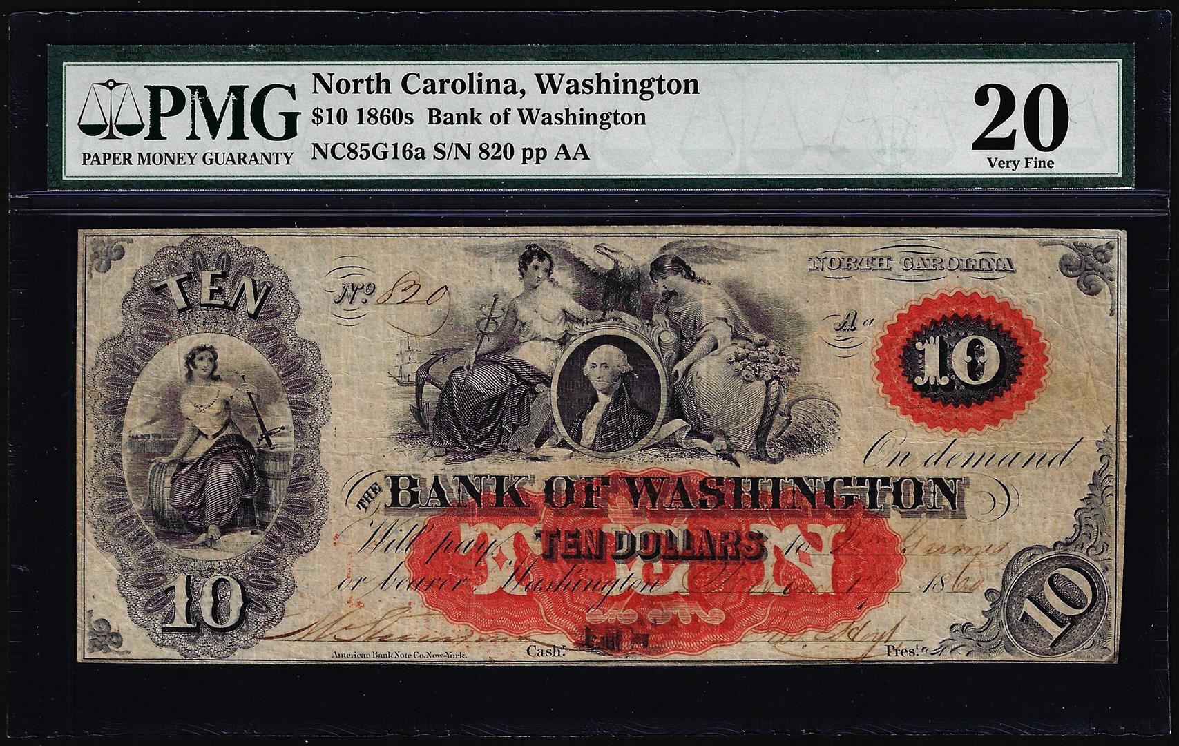 One 1860's $10 Bank of Washington North Carolina Obsolete Note PMG Very Fine 20. PMG Certified.