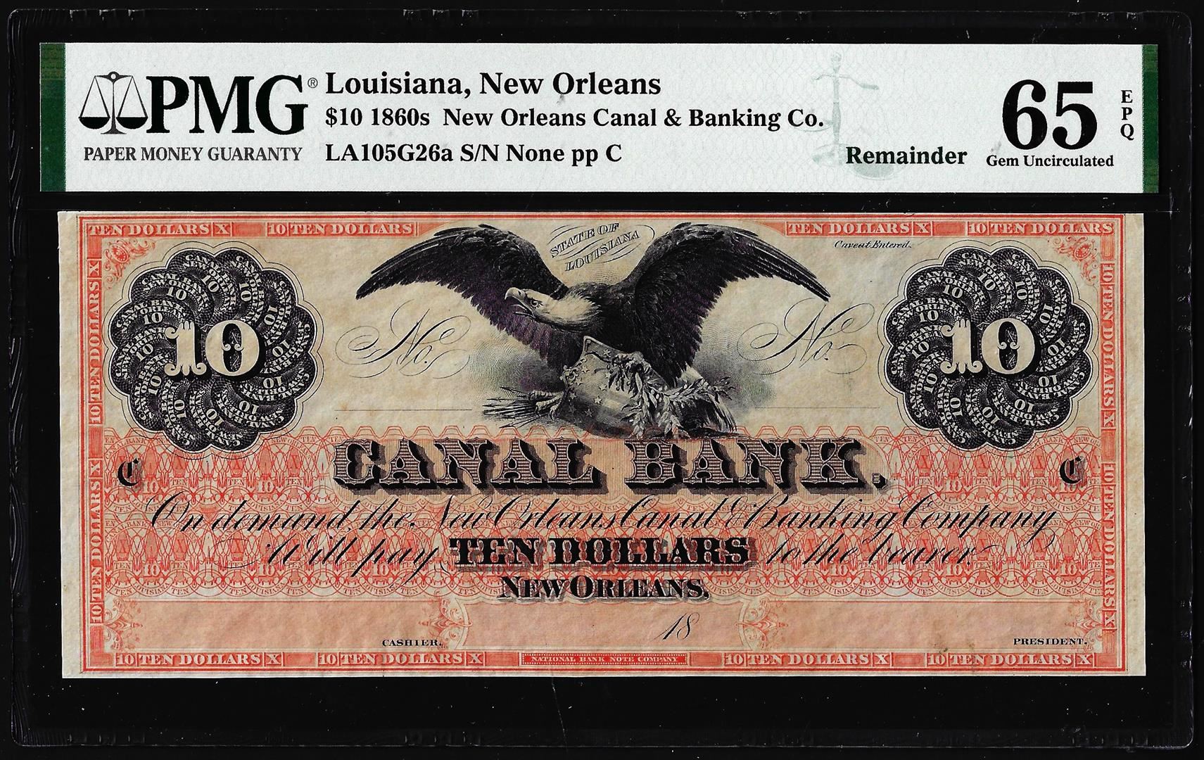 1860's $10 New Orleans Canal & Banking Co. Obsolete Note PMG Gem Uncirculated 65EPQ