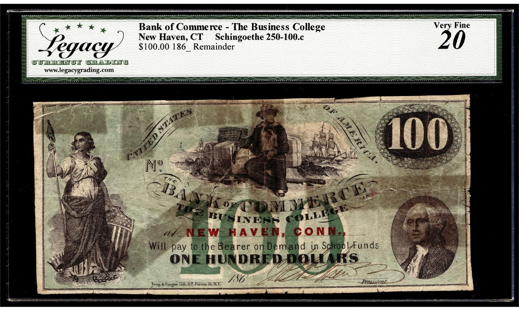 One 1860's $100 Bank of Commerce Business College New Haven, CT Note Legacy Very Fine 20. Legacy Graded.