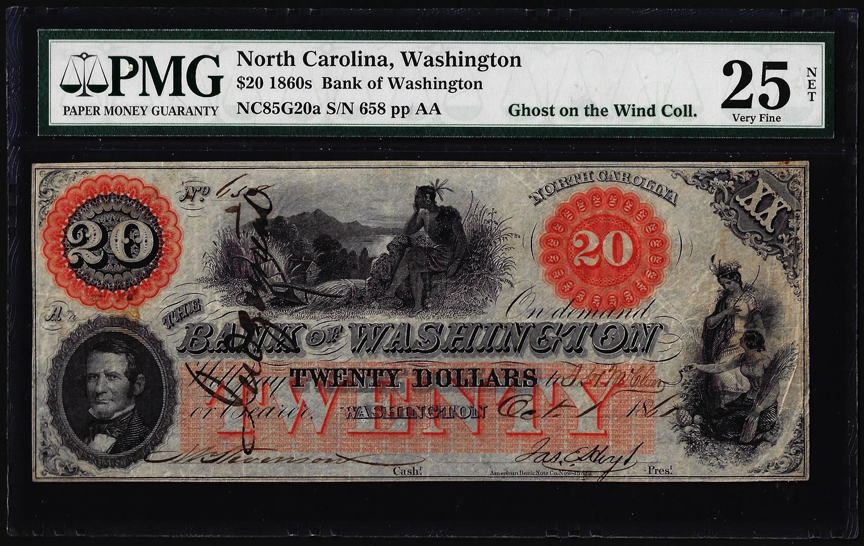 1860's $20 Bank of Washington North Carolina Obsolete Note PMG Very Fine 25 Net