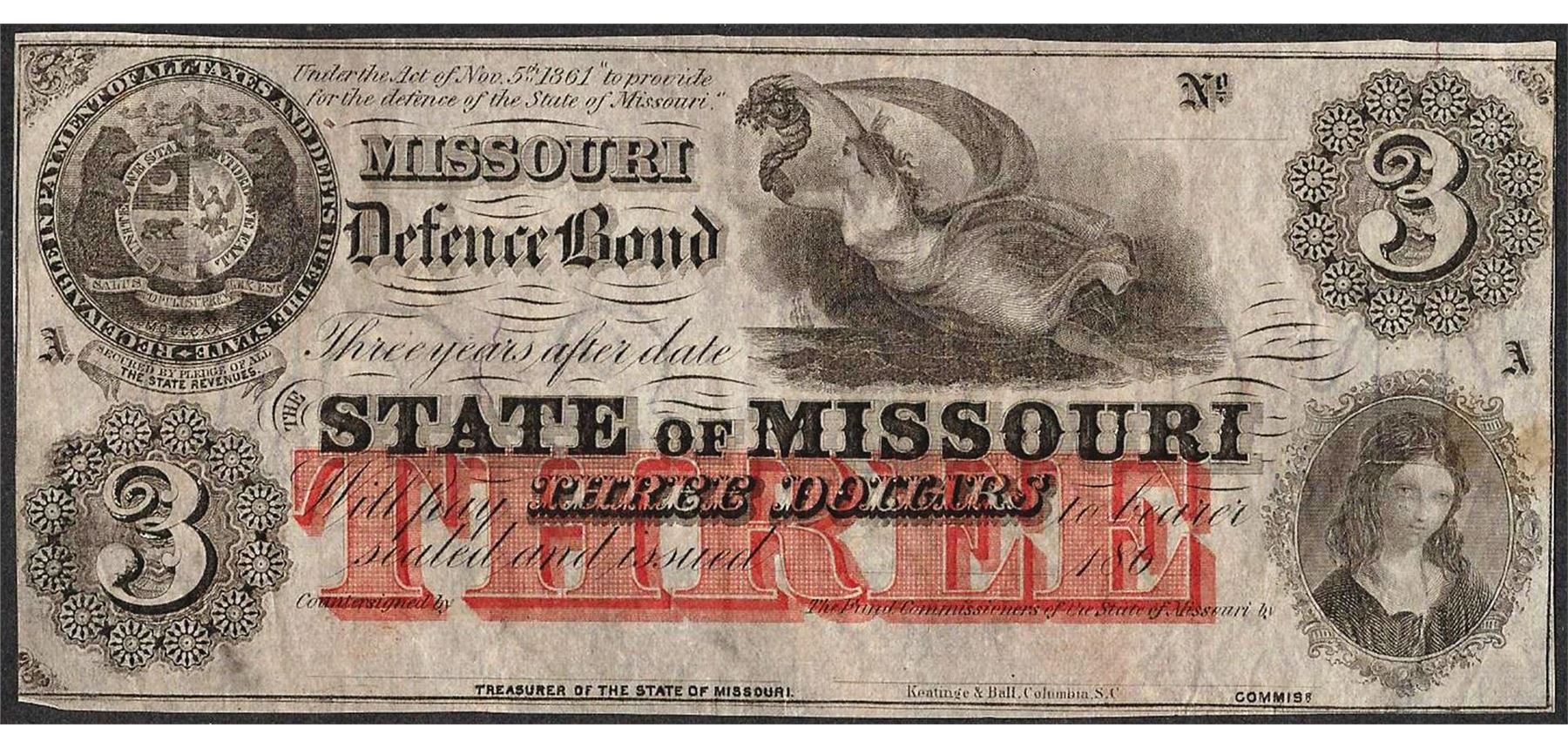 One 1860's $3 State of Missouri Defence Bond Obsolete Currency Note.