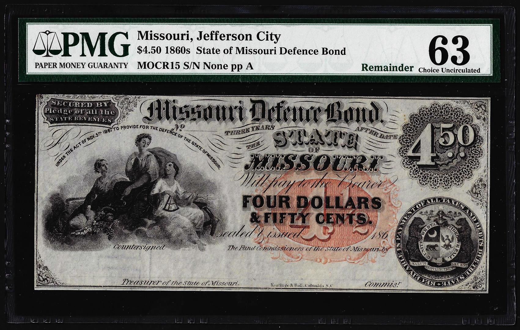 One 1860's $4.50 State of Missouri Defence Bond Obsolete Note PMG Choice Uncirculated 63. PMG Certified.