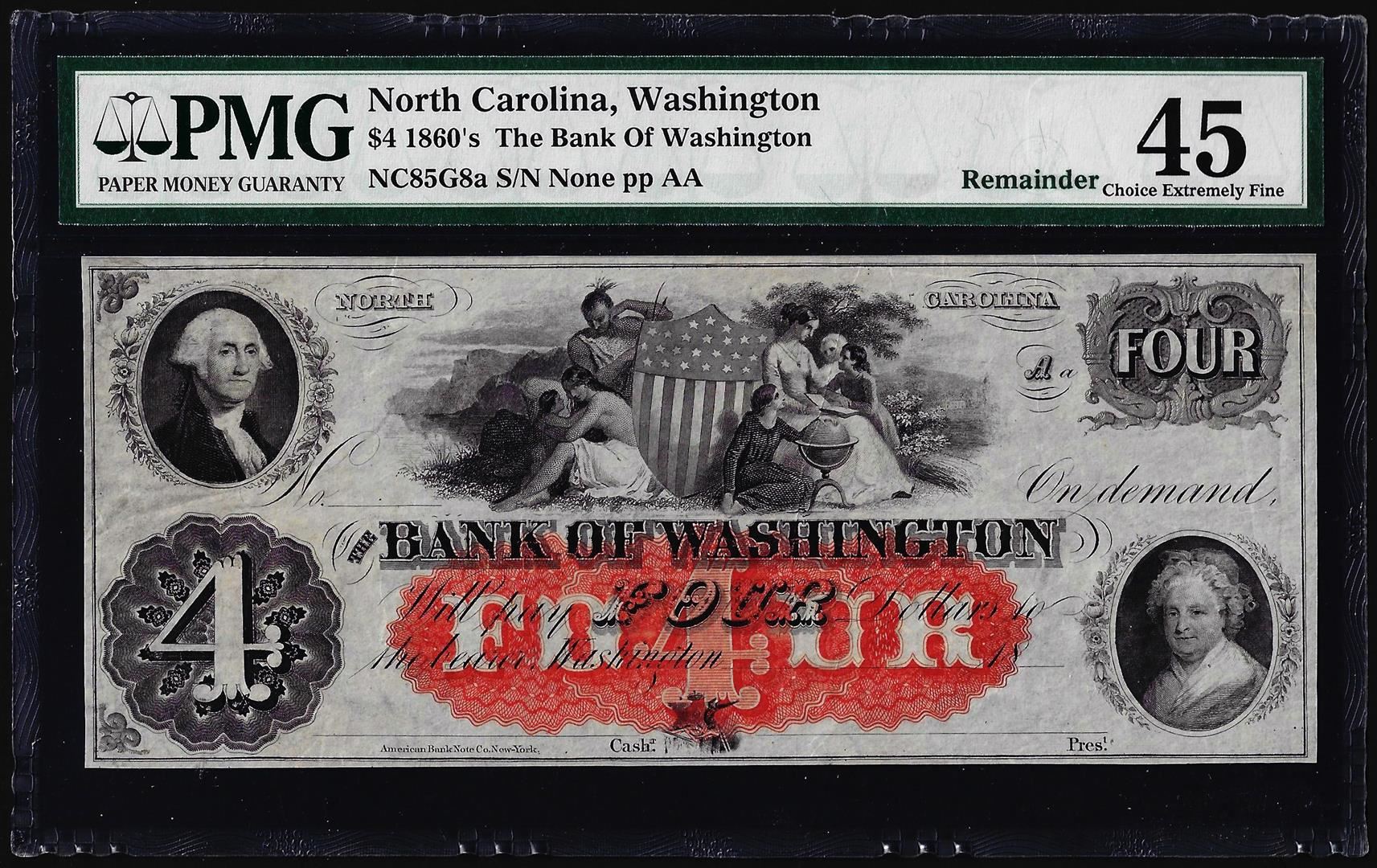 One 1860's $4 Bank of Washington North Carolina Obsolete Note PMG Choice Extremely Fine 45. PMG Certified.