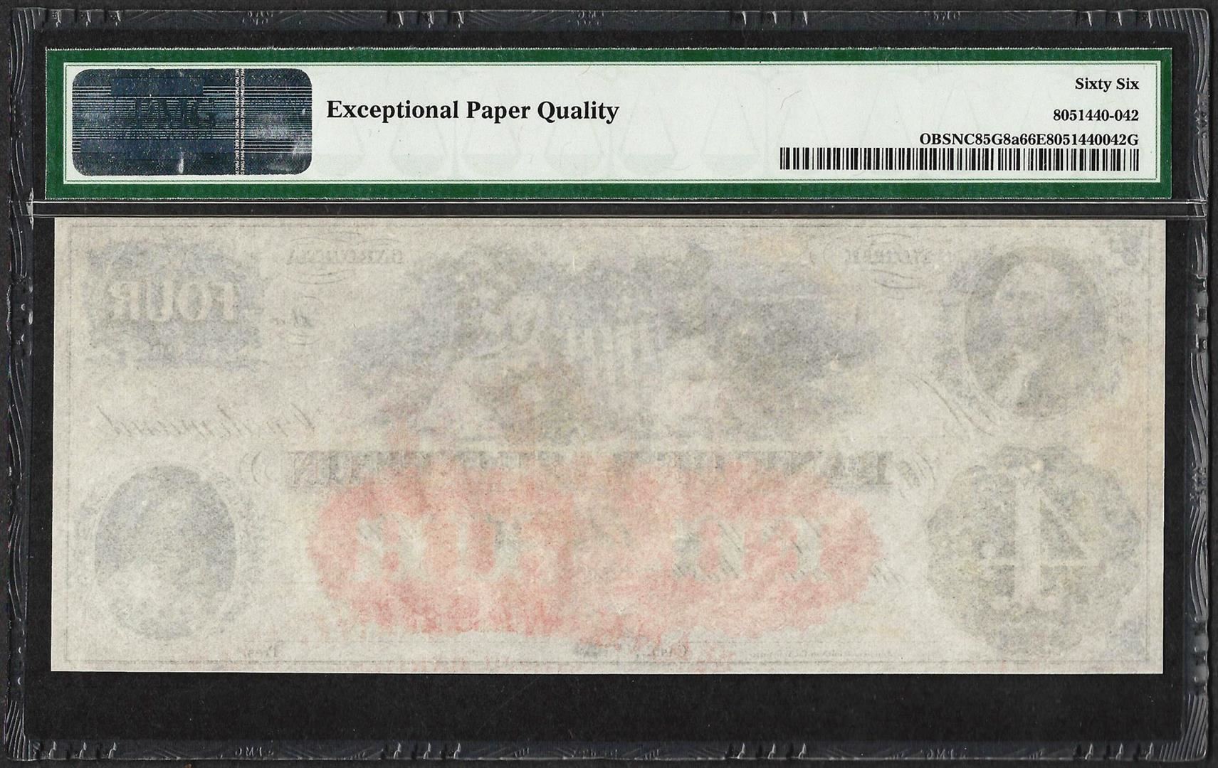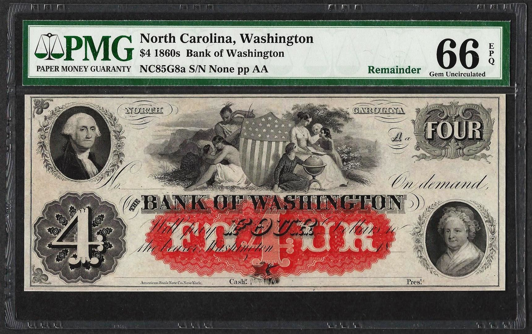 One 1860's $4 Bank of Washington North Carolina Obsolete Note PMG Gem Uncirculated 66EPQ. PMG Certified.