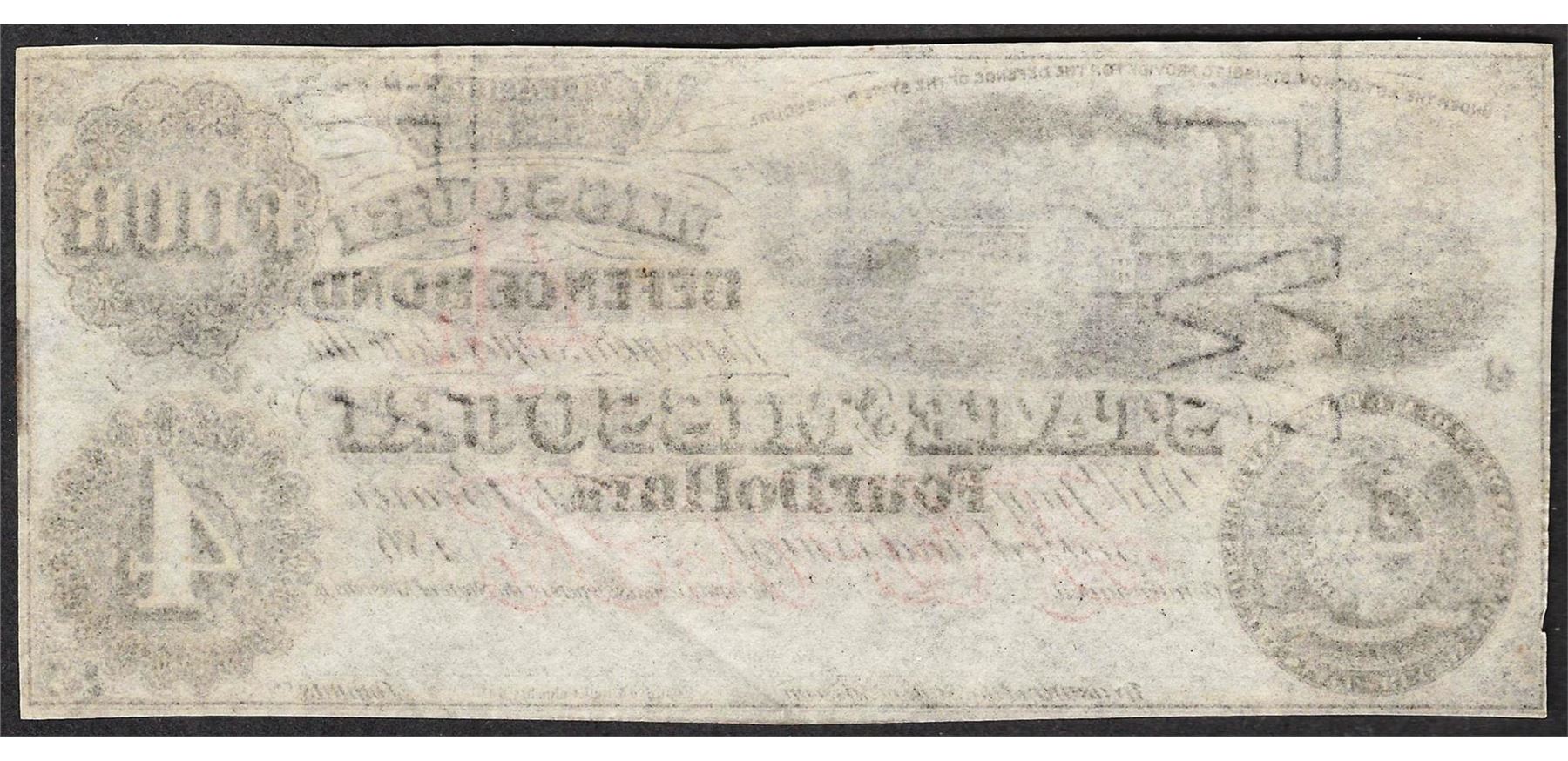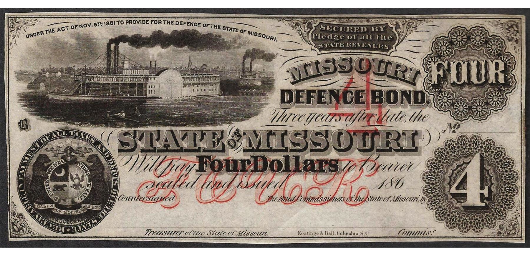 One 1860's $4 The State of Missouri Defence Bond Obsolete Note.