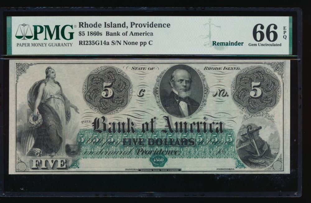 One 1860's $5 Providence RI Obsolete Note PMG 66EPQ.