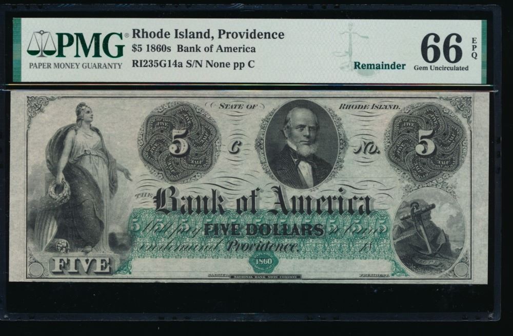 One 1860's $5 Providence RI Obsolete PMG 66EPQ.