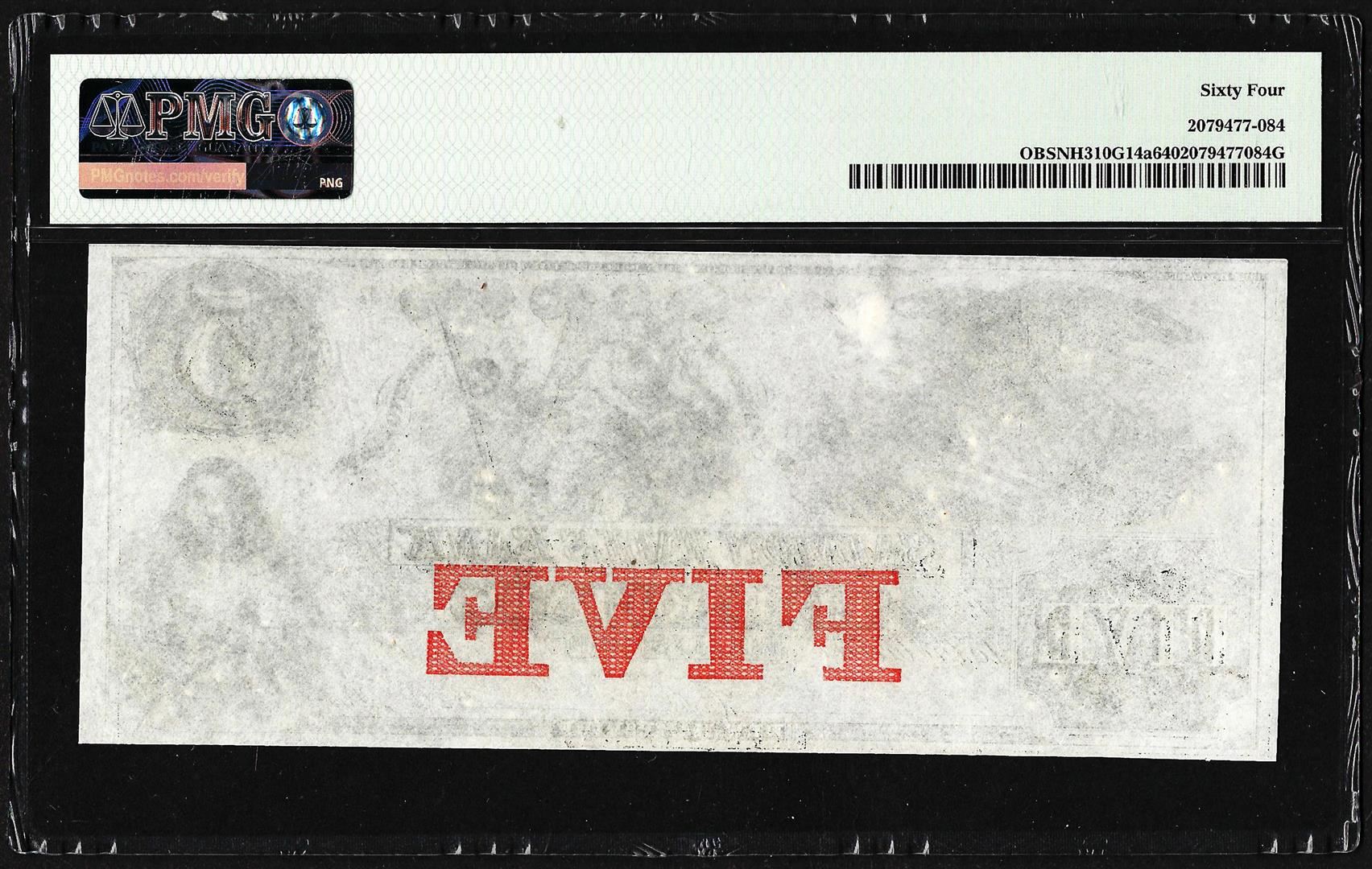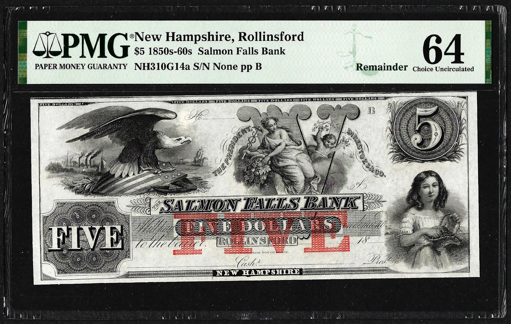 One 1860's $5 Salmon Falls Bank Rollinsford, NH Obsolete Note PMG Superb Gem Uncirculated 64. PMG Certified.