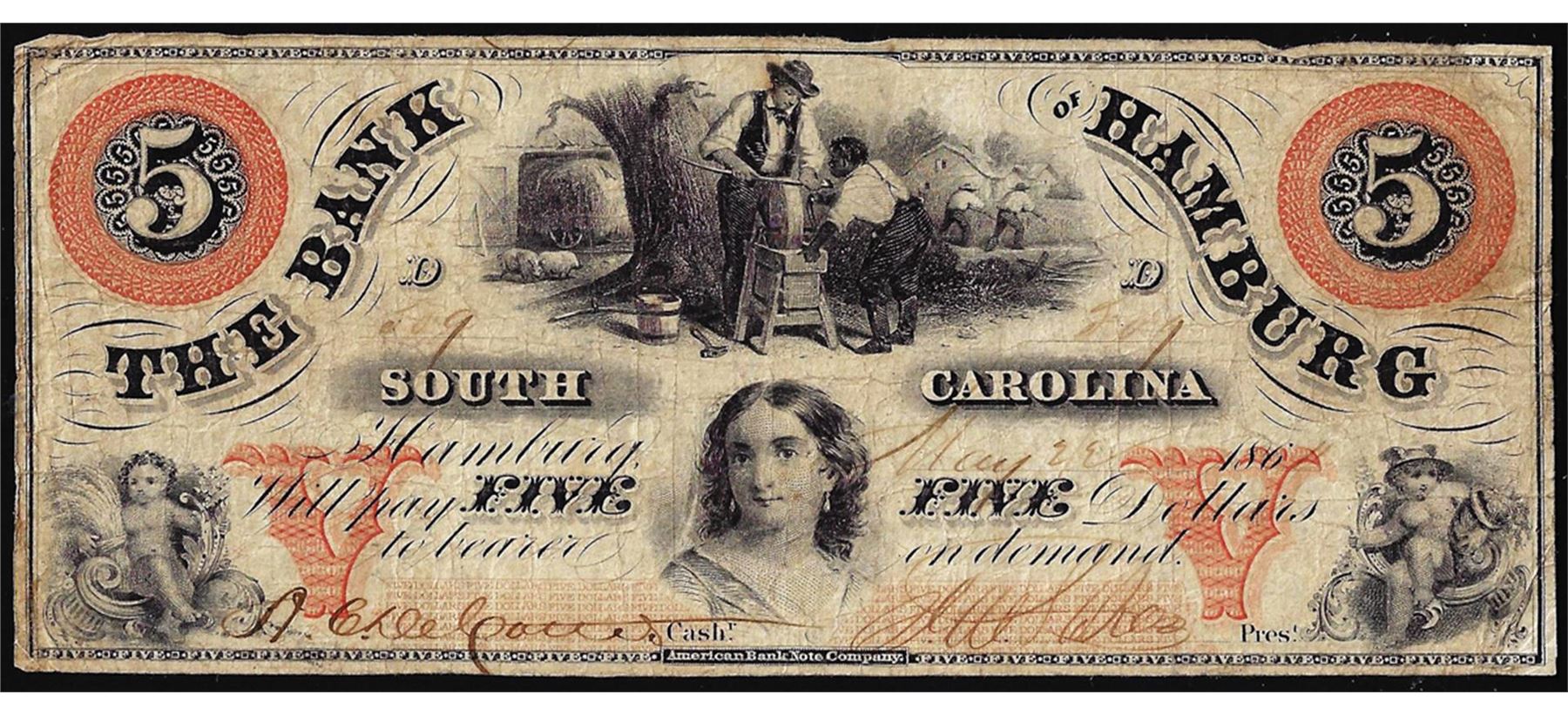 One 1860's $5 The Bank of Hamburg South Carolina Obsolete Note.