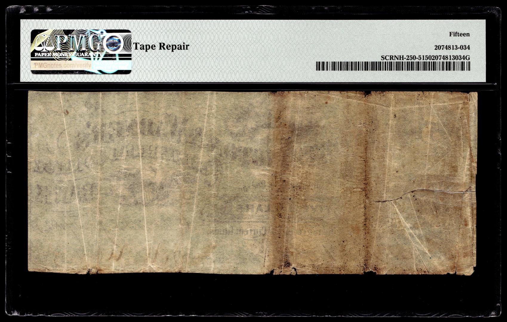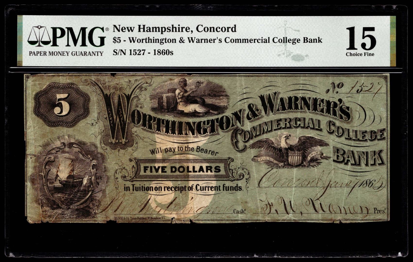 One 1860's $5 Worthington & Warner's CB Concord, NH College Bank Note PMG Choice Fine 15. PMG Certified.