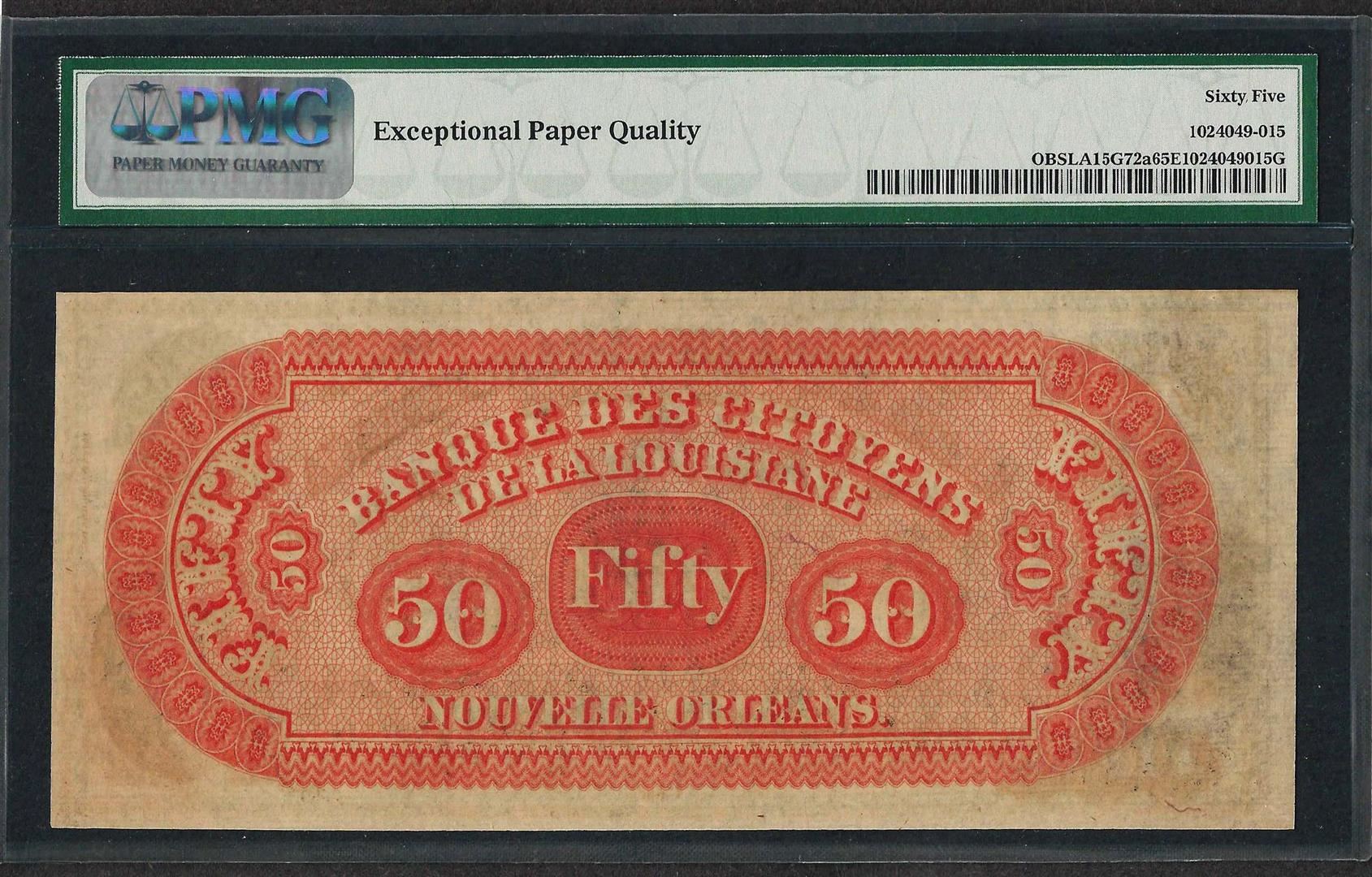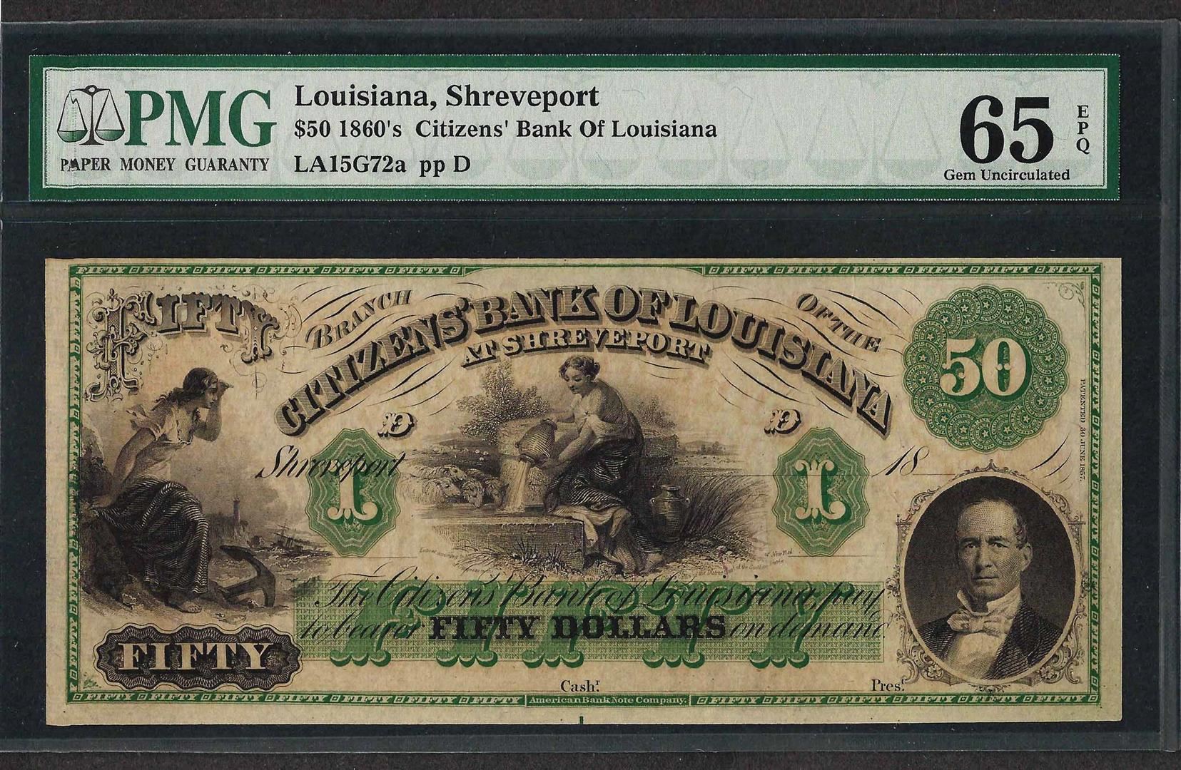 One 1860's $50 Citizens Bank of Louisiana Obsolete Note PMG Gem Uncirculated 65EPQ. PMG Certified.
