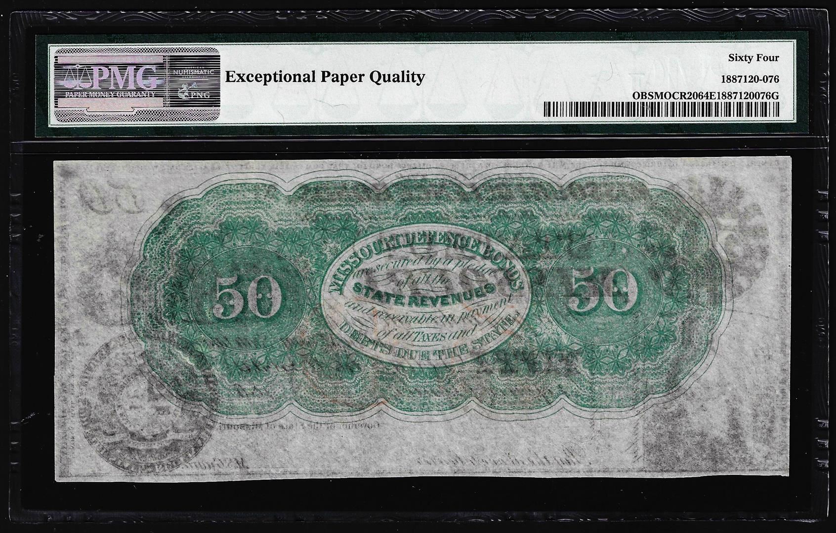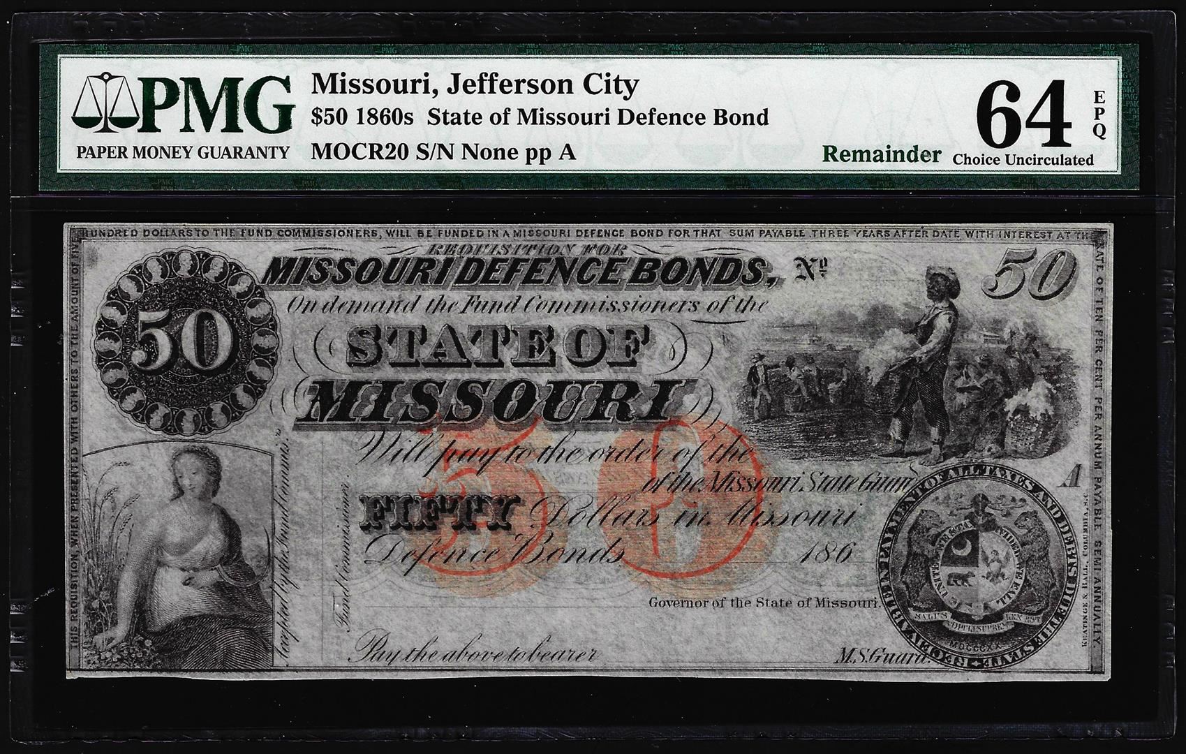 1860's $50 State of Missouri Defence Bond Obsolete Note PMG Choice Uncirculated 64EPQ