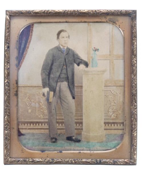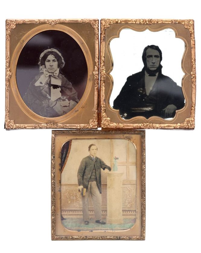Featured in this lot is this Ambrotype and Daguerreotype photographs, circa 1860's. There are three ambrotypes in this collection. The first is of a woman wearing bonnet and winter clothes. The second is of a man sitting down with a neck beard. The last is of a young man holding a book and striking a pose by a vase. The condition of these ambrotypes is good to fair, with no obvious signs of damage. The measurements of these ambrotypes are 3 1/4" x 2 3/4".